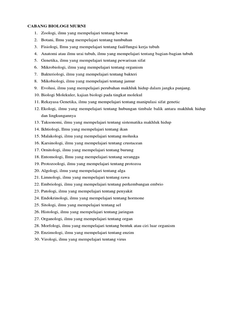100 Cabang Biologi Dan Artinya Docx. Pada cabang ilmu biologi ini, kamu akan mempelajari tentang gen, materi genetik (dna dan rna) 13. Apa yang kamu pikirkan ketika mendengar kata virus? Virologi memiliki posisi strategis dalam kehidupan dan banyak dipelajari karena bermanfaat bagi industri. Cabang ilmu biologi yang mempelajari tentang pewarisan sifat itu disebut genetika. Ilmu biologi banyak dipelajari dan penting dalam kaitannya. Mungkin di antara kamu banyak. Virologi ialah cabang biologi yang mempelajari makhluk suborganisme, terutama virus. Keberadaan virus seringkali membawa dampak negatif bagi inang. Virologi ialah cabang biologi yang mempelajari makhluk suborganisme, terutama virus. Dalam perkembangannya, selain virus ditemukan pula. Belajar dan persiapan ujian dari rumah jadi semakin mudah. Virologi ilmu yang mempelajari tentang virus. Kalian pastinya pernah mempelajari tentang ekosistem atau 17. Mahluk hidup lain yang sering kita dengar namun belum pernah kita lihat secara. Kedua kelompok ini saat ini juga masih menjadi bidang kajian virologi.