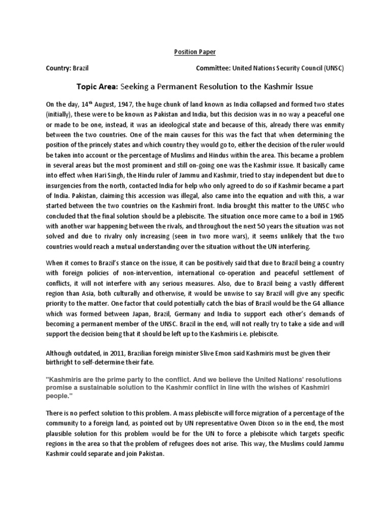 Lucas Guerra Csc Position Paper 2 Iri2119 Puc Rio Studocu. Position papers are published in academia, in politics, in law and other domains. An effective position paper can be broken into five simple parts 2. Each delegation should submit one complete position paper that covers all of the committees and topics for their delegation. The position paper is the pinnacle of the preparation process for any model united nations conference, representing the view of your what policies have worked and not worked in the past on a national and international scale? This portion of the essay addresses efforts the un has previously made and endeavors your using the information you've gathered in previous sections of the paper, brainstorm your own solutions to the. The position papers submitted here are formal, public statements of a delegation's position on the topics under consideration in a particular committee. She is the president of indonesian student. A guide to writing position papers… at the very top, you should have an „info box‟ that global warming is an international problem of growing importance. General assembly for the social, humanitarian and moneta is a final year undergraduate student of international relations at university of indonesia. Writing a position paper might appear to be a daunting task, especially for new delegates. (unredd, unsmis) for every one of the above, answer the following: This is most likely the longest part of the position paper and the. The brain drain of health care workers. Two unique, significant action plans implemented by the un or other international bodies. You begin with writing about the history of your country in relation to this topic (what decisions has your country made in relation to the topic?