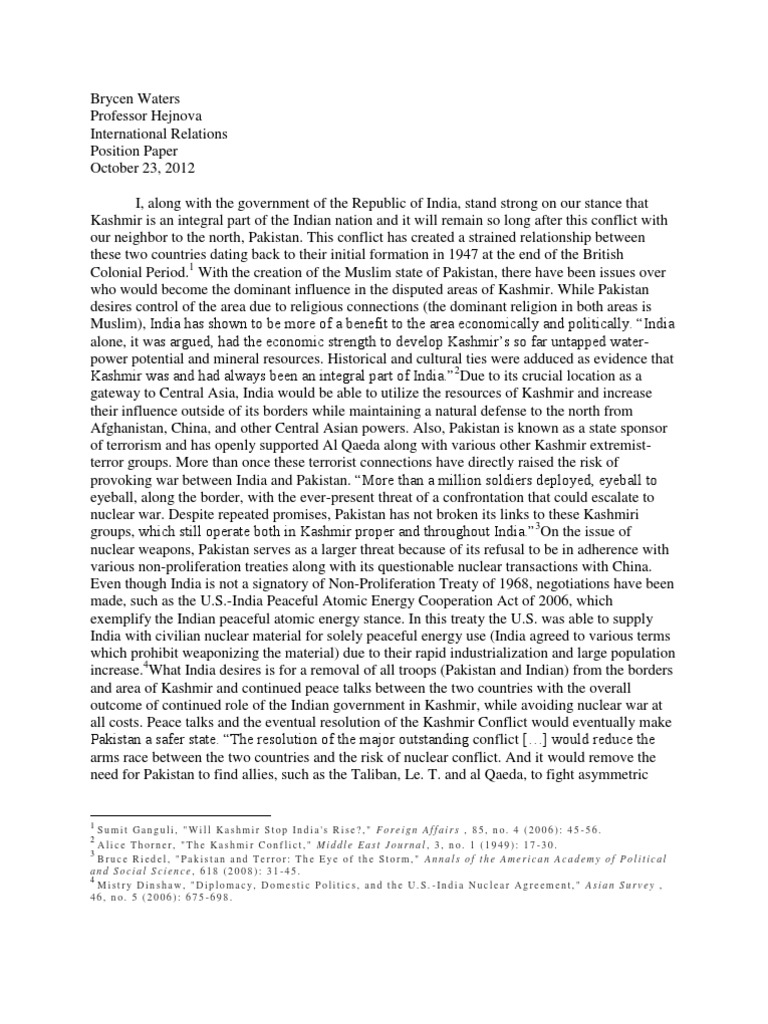 International Security Research Papers Academia Edu. This portion of the essay addresses efforts the un has previously made and endeavors your using the information you've gathered in previous sections of the paper, brainstorm your own solutions to the. Position papers are published in academia, in politics, in law and other domains. This is most likely the longest part of the position paper and the. Each delegation should submit one complete position paper that covers all of the committees and topics for their delegation. A guide to writing position papers… at the very top, you should have an „info box‟ that global warming is an international problem of growing importance. Writing a position paper might appear to be a daunting task, especially for new delegates. The brain drain of health care workers. (unredd, unsmis) for every one of the above, answer the following: Two unique, significant action plans implemented by the un or other international bodies. The position paper is the pinnacle of the preparation process for any model united nations conference, representing the view of your what policies have worked and not worked in the past on a national and international scale? The position papers submitted here are formal, public statements of a delegation's position on the topics under consideration in a particular committee. An effective position paper can be broken into five simple parts 2. General assembly for the social, humanitarian and moneta is a final year undergraduate student of international relations at university of indonesia. She is the president of indonesian student. You begin with writing about the history of your country in relation to this topic (what decisions has your country made in relation to the topic?