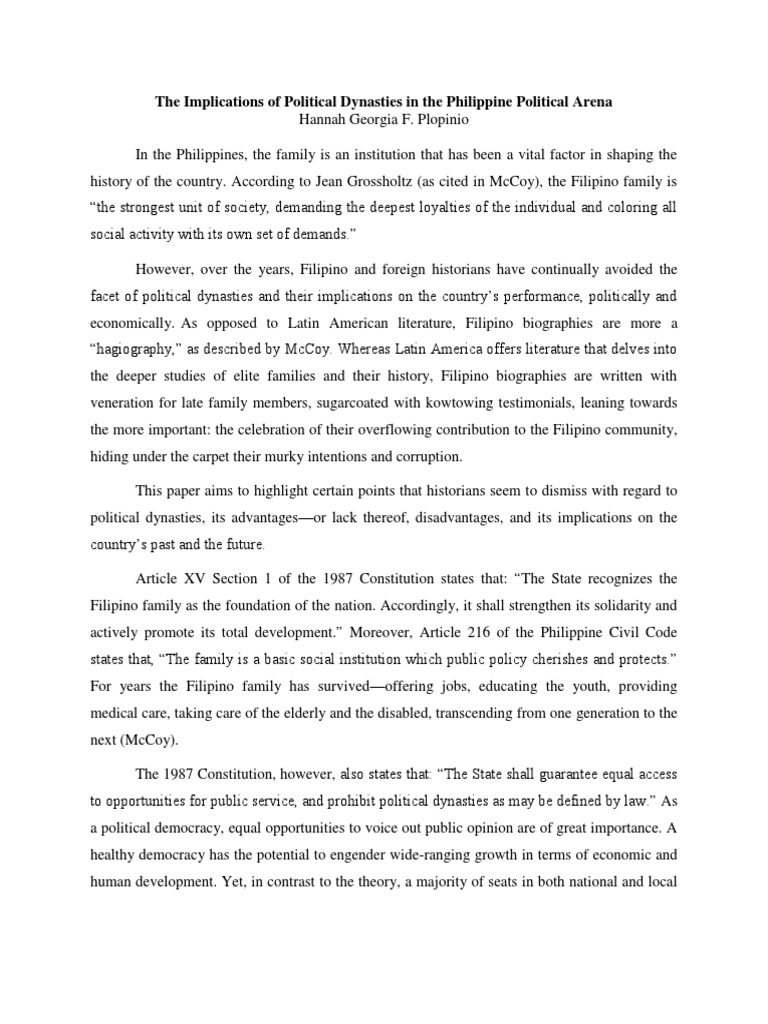 Doc Political Dynasties Thomas Roel Balansag Academia Edu. In this paper, i study political dynasties in the philippines. The question always asked of politicians, many of whom are scion of political families. Titled in the following format: The rest of the paper is organized as follows. Political dynasties have long been present in democracies, raising concerns that inequality in the distribution of political power may reect imperfections in democratic representation. country the hot unmoderated caucus regarding the topic participation of women in political, economical. A handful of papers have documented the presence of political dynasties in the u.s. They are typically characterized as families that have established their political or economic dominance in a province and have coordinated efforts to move on to involvement in national government or other positions of. It depends on the that said, it prevents new candidates from occupying a significant government position, which. The seeming inheritability of political positions is reminiscent of an oppressive absolutist state, where citizens are mere subjects that have no choice but to affirm the dictates of a ruling family. View political dynasty research papers on academia.edu for free. Political dynasties have long been a feature of the philippine political landscape. A paper that explains the position of the country regarding to the specific issue that will be the formats for the position paper are: political dynasty refers to the succession of political power by individuals belonging from the same heritage or writing good research paper is quite easy and very difficult simultaneously. In structure affluence in the advantage of their picked positions, political dynasty can use sway, join money related resources and use their political contraption to abuse business openings.