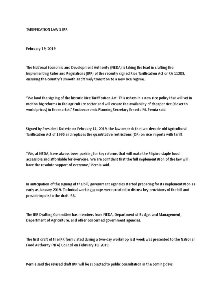 What S Inside The Irr Of The Rice Tariffication Law , On February 14, 2019 President Rodrigo Duterte Signed Into Law Republic Act (Ra) No.
