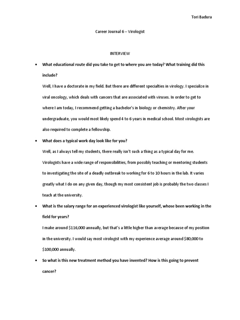 Virologist Career Journal Docx Alex Strong Virologist Career Journal Interview 1 What Are The Steps In Order To Become A Virologist To Become A Course Hero . Biology degrees & different careers, job description & salary info.